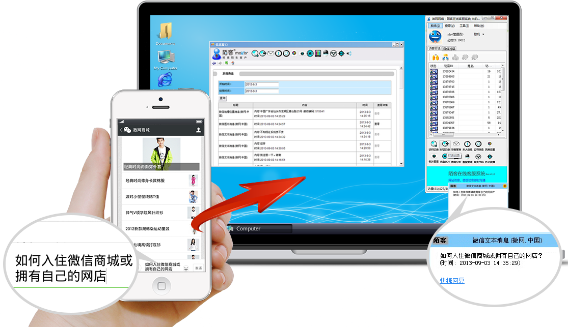 陌客mokor在微信商城中,只要訪客在公眾號(hào)中輸入信息,即可在陌客客戶(hù)端軟件即時(shí)提醒,可以快速回復(fù),回復(fù)直接在公眾號(hào)中顯示。這樣,公眾號(hào)可以即時(shí)與陌客端即時(shí)對(duì)話(huà)交流。